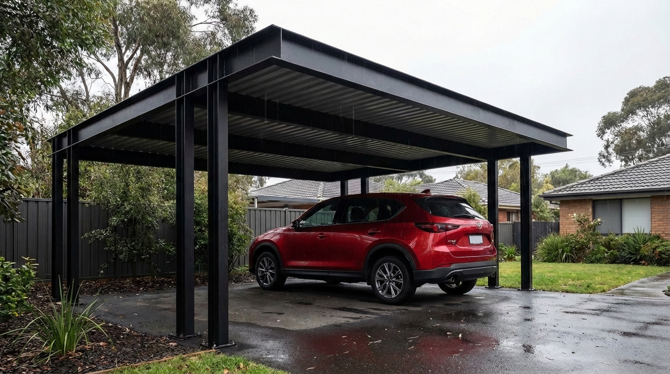 Project: Carport – Genk Afwerking: Zwart matte poedercoating Klant: Up-To-Date Web Design